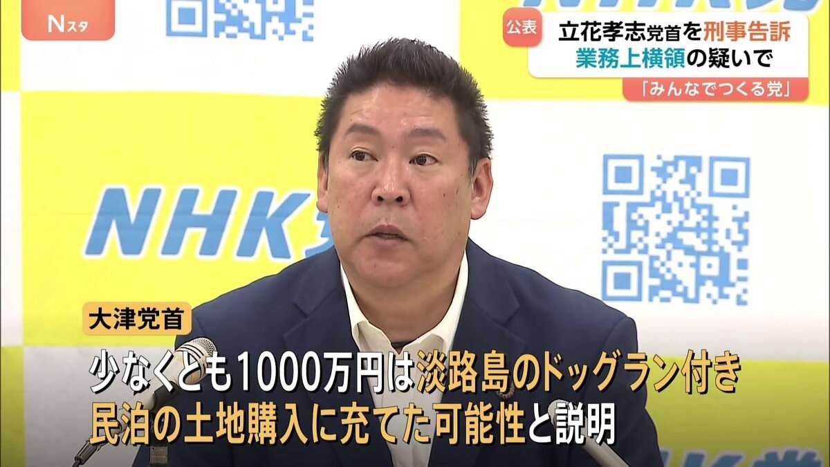 「みんなでつくる党」が「NHKから国民を守る党」の立花孝志党首を業務上横領の疑いで刑事告訴 警視庁が受理 少なくとも1000万円はドッグラン付き民泊の土地購入に充てられたか