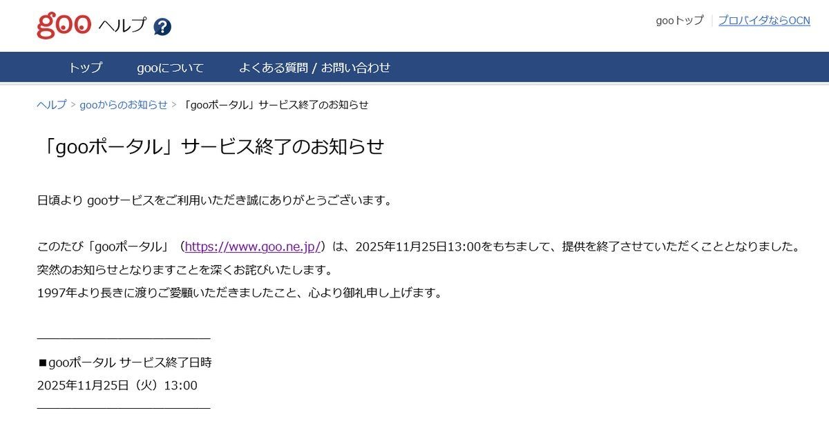 NTTドコモが運営する「gooポータル」は、2025年11月25日13時をもってサービスを終了すると発表した。