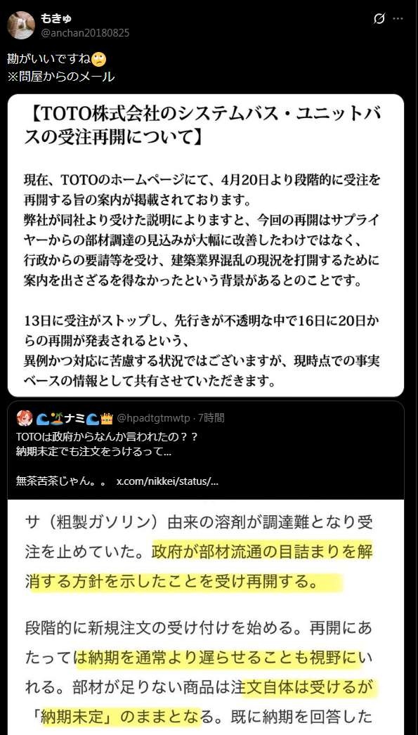 【とんでもないことが発生中】TOTOさん高市政府に無理やり注文受注の再開をさせられる → 当然、品が無いので「納期未定」のまま 建設業界が大混乱に