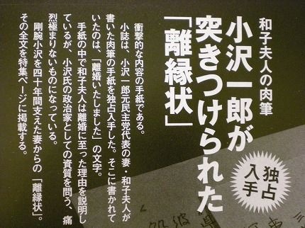 『週刊文春』に掲載された小沢一郎夫人の和子による「離縁状」を読んだとき、「やっぱり」と合点がいった。未曾有の3.11震災が発生したとき、岩手選出の小沢がどう動くのか、誰もが注目したはずだ。私もそうだった。だが一向に地元に入ったというニュースが飛び込んでこない。「故郷が塗炭の苦しみにあるとき、小沢は何をしているのか」、不思議でならなかった。
