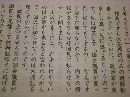 福島ですら原発周辺のみの避難勧告しかでていないのに、政治家が東京から真っ先に逃げるというのです。私は仰天して「国会議員が真っ先に逃げてどうするの!なんで岩手に帰らないのか!内々の情報があるならなぜ国民に知らせないの」と聞きました。