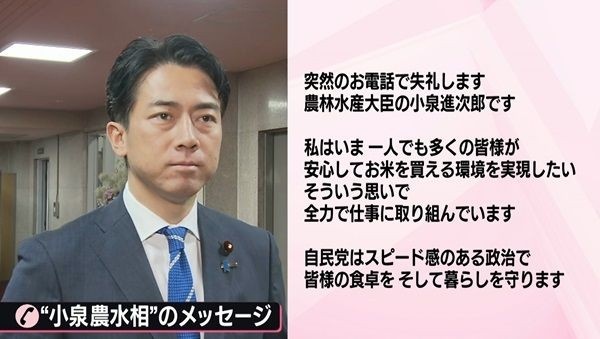 「突然のお電話で失礼します。農林水産大臣の小泉進次郎です。私はいま、一人でも多くの皆様が安心してお米を買える環境を実現したい。そういう思いで全力で仕事に取り組んでいます。自民党はスピード感のある政治で皆様の食卓を、そして暮らしを守ります」菅原解説委員