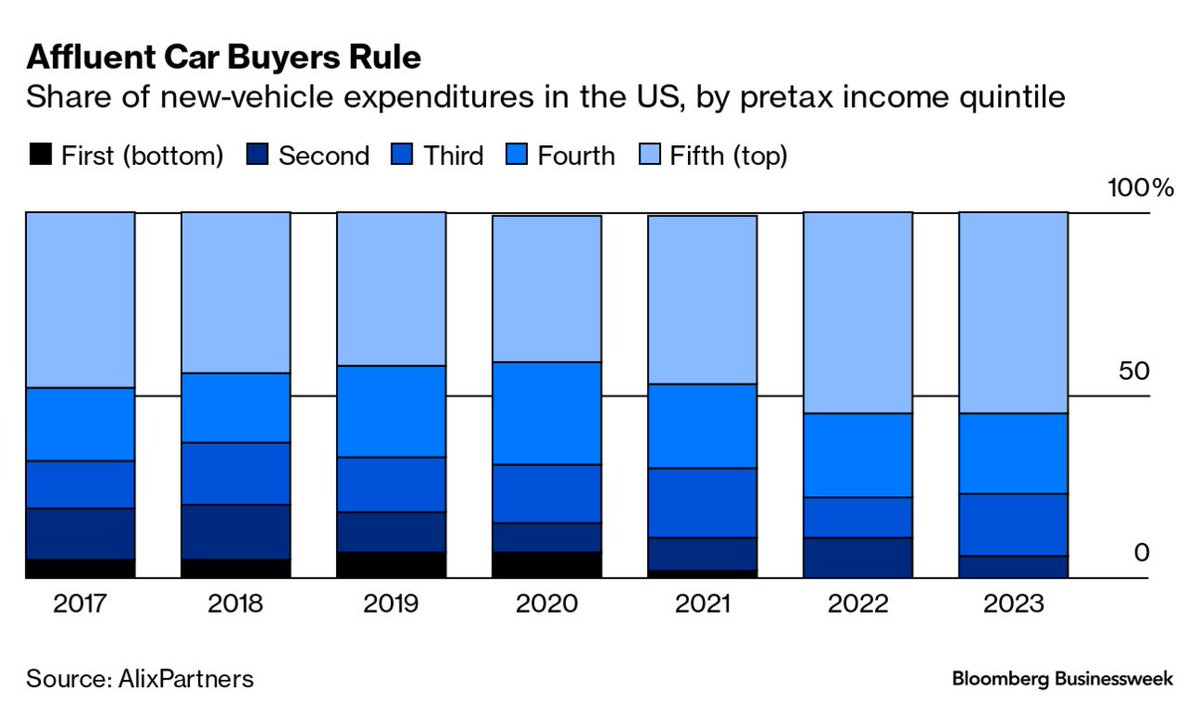・自動車ローン金利は新車購入で平均7.1%、5年前は5.7%…大統領選の争点の一つとなっているインフレ議論では、住宅と食品のコスト増に最も注目が集まっている。だが自動車の値ごろ感の危機は「家の車庫に新車を止める」という米国民の生活における基本的な願望を台無しにしている。今では富裕層だけが享受できる領域になりつつある。