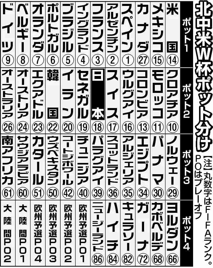 ◆北中米W杯抽選会 12月5日(日本時間同6日)に米ワシントンDCで開催。ポット1のチームから開催国のメキシコ(A組)、カナダ(B組)、米国(D組)の組を除いて、