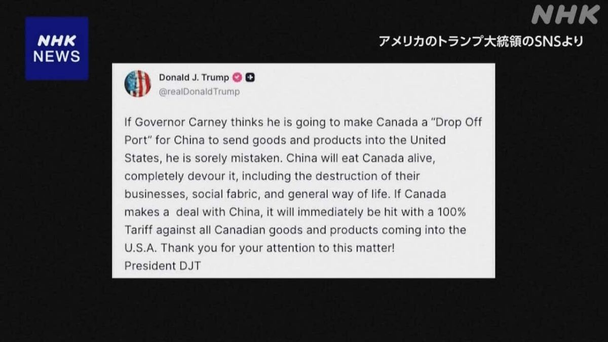 アメリカのトランプ大統領は、カナダが中国と貿易協議で合意するならば、カナダからのすべての輸入品に100%の関税を課すとSNSに投稿しました。