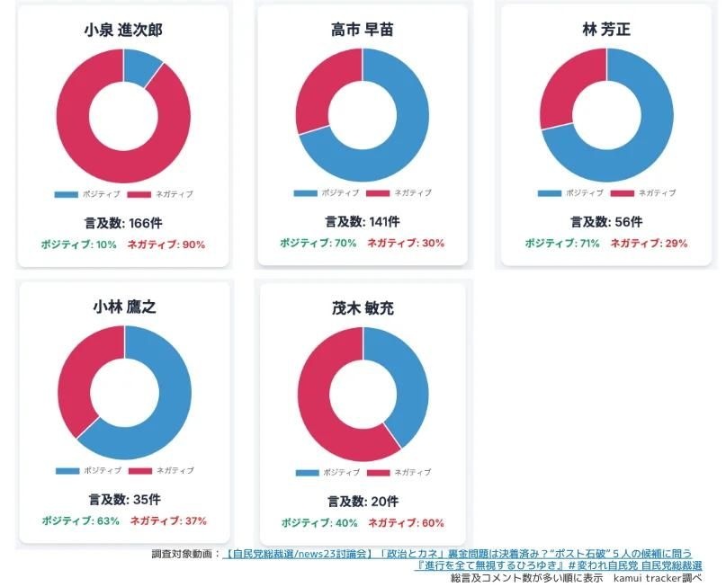 【ネットでは高市氏は好かれ、小泉氏は嫌われてる】マスコミ分析とは違う! 総裁選候補のYouTube分析…小泉氏にポジティブな評価は10%にとどまり、90%がネガティブなコメント