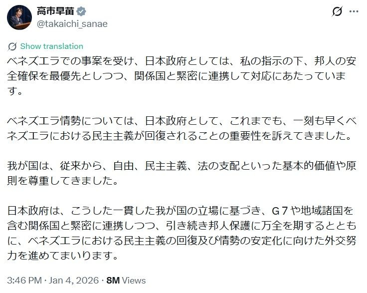 米国のベネズエラ攻撃について、高市早苗首相が4日にX(旧ツイッター)で「ベネズエラの民主主義回復及び情勢安定化に向け外交努力をする」と投稿したが、