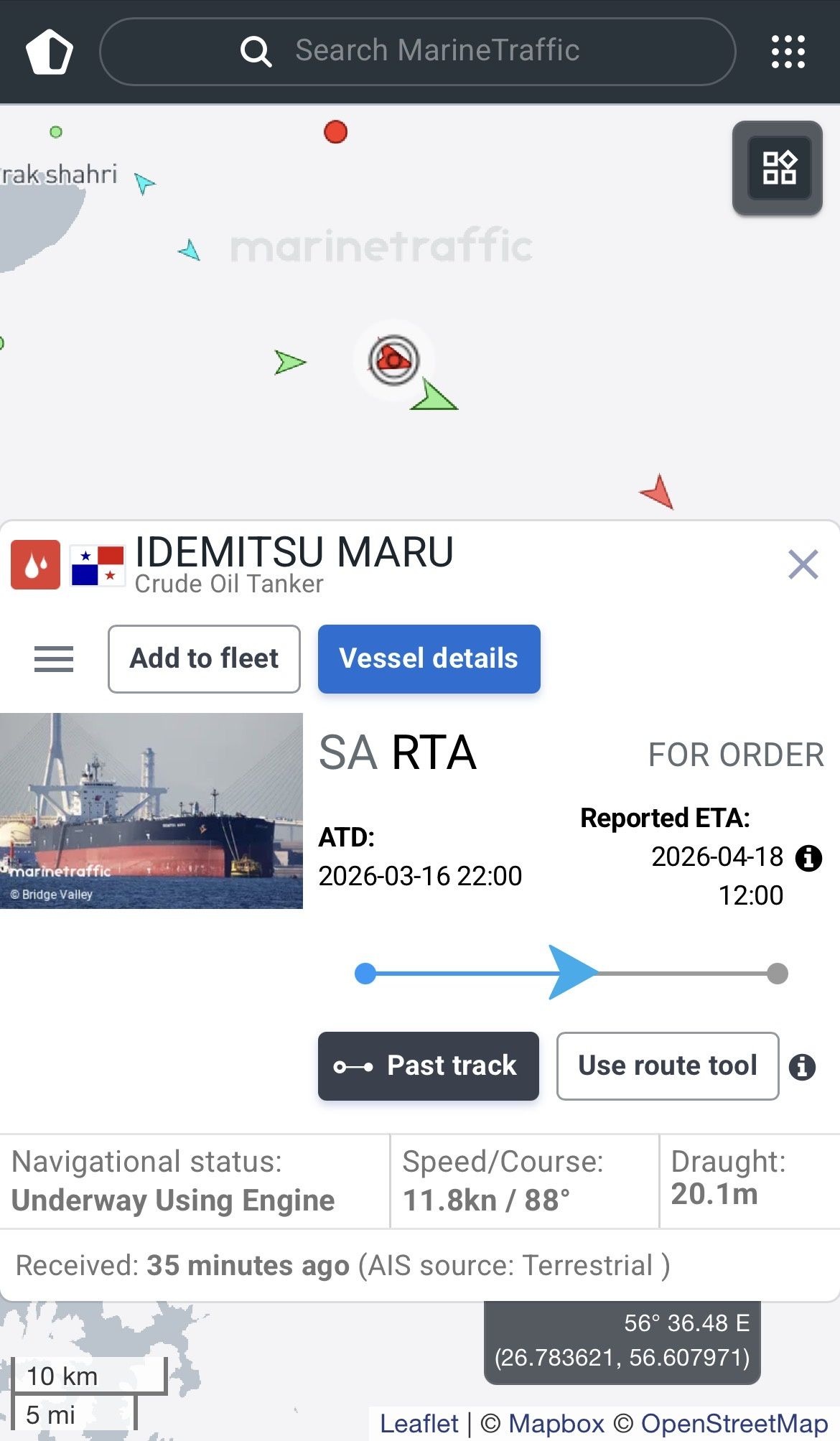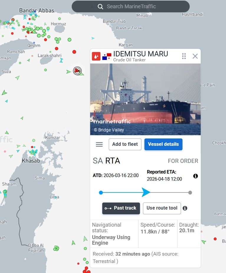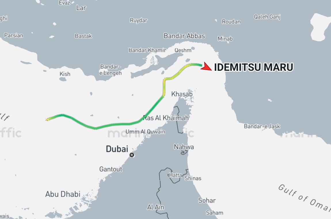 「IDEMITSU MARU(出光丸)」(パナマ船籍)が日本時間28日午後現在、ホルムズ海峡を通過中のもようだ。サウジアラビア産原油約200万バレルを積載しているとみられる。