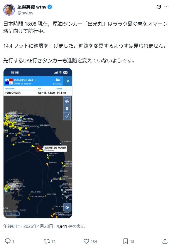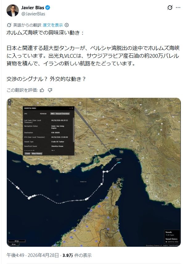 https://www.sankei.com/article/20260428-5CD2AUOBWBBHND2XZKHLG4J3KQ/船舶位置情報の提供サイト「マリントラフィック」によると、出光タンカー(東京)が所有する超大型タンカー
