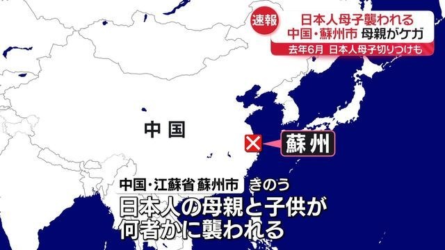 日中関係筋によりますと、7月31日、中国東部の江蘇省蘇州市で、日本人の母親と子供が突然、何者かに襲われ、母親が殴られてケガをしたということです。