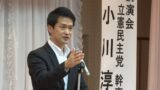 島根県出雲市で講演した小川氏は、米価高騰を巡り、「備蓄米を5キロで2000円はいいが、国民の税金で買い取った米で、万一の際に備える米だ」と強調した。