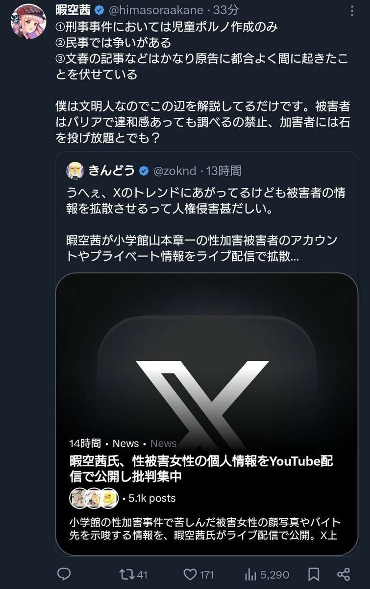 SNSで暇空茜さんが「堕天作戦」性加害被害者の顔写真やアカウント情報を配信で示唆し物議です。被害者保護を求める声が相次いでいます。暇空茜など。