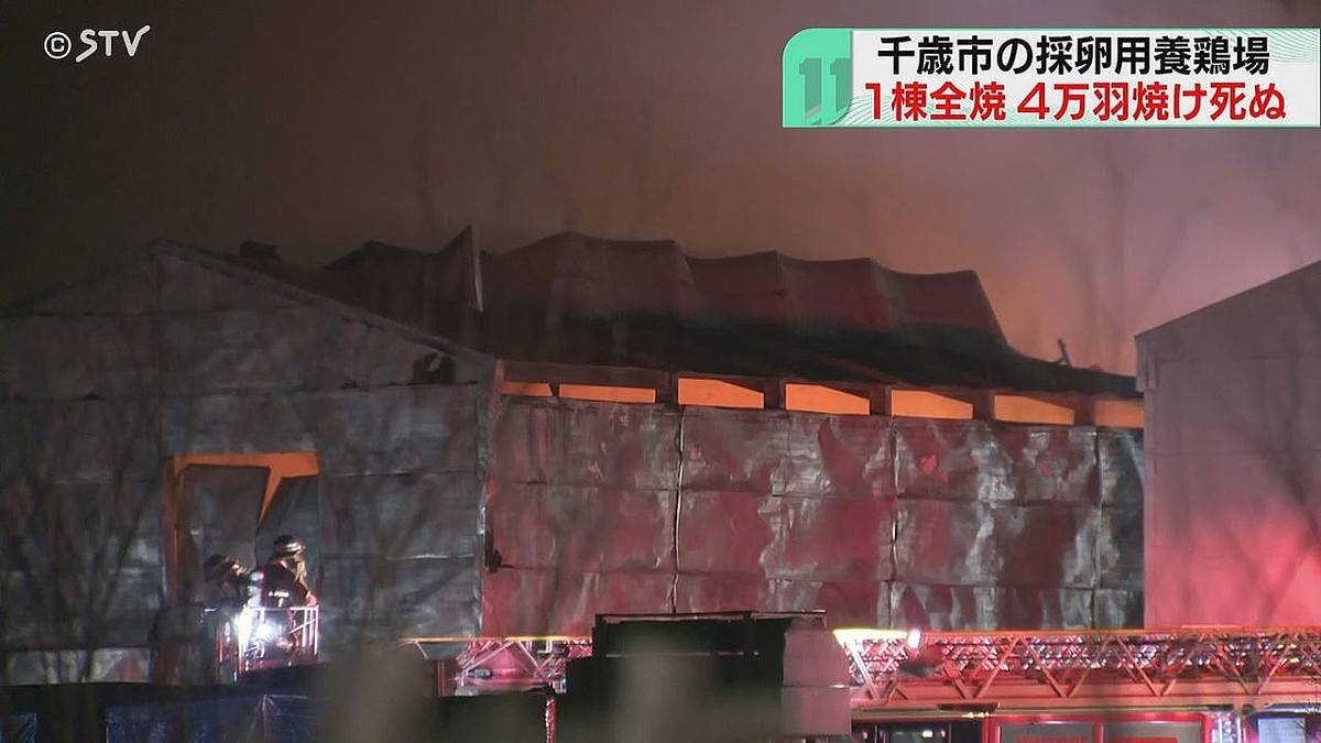 北海道千歳市の養鶏場で鶏舎が全焼する火事があり、飼育されていたニワトリおよそ4万羽が焼け死にました。