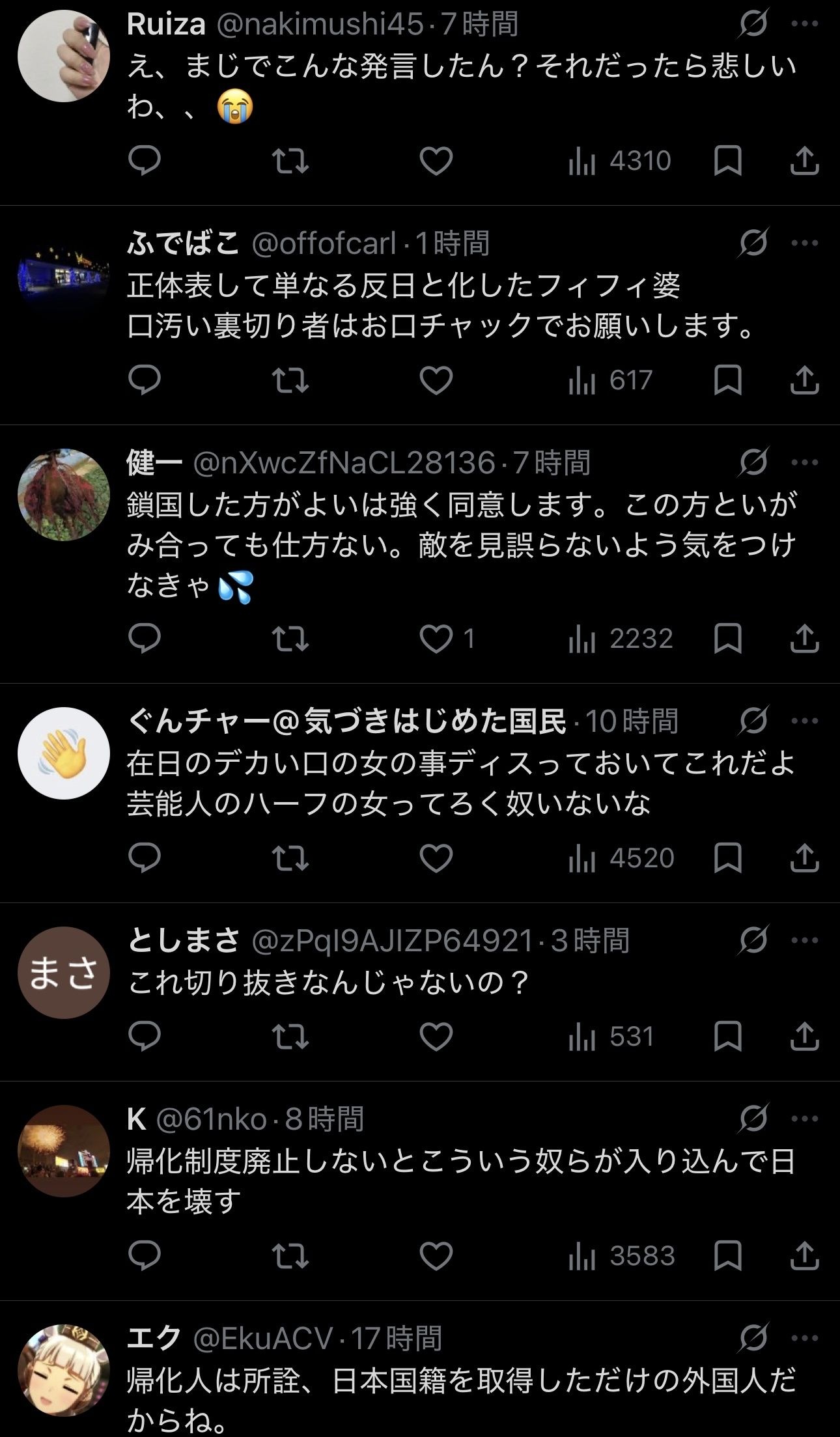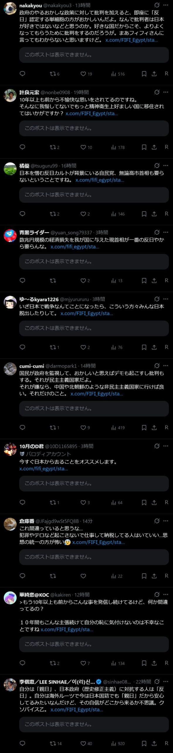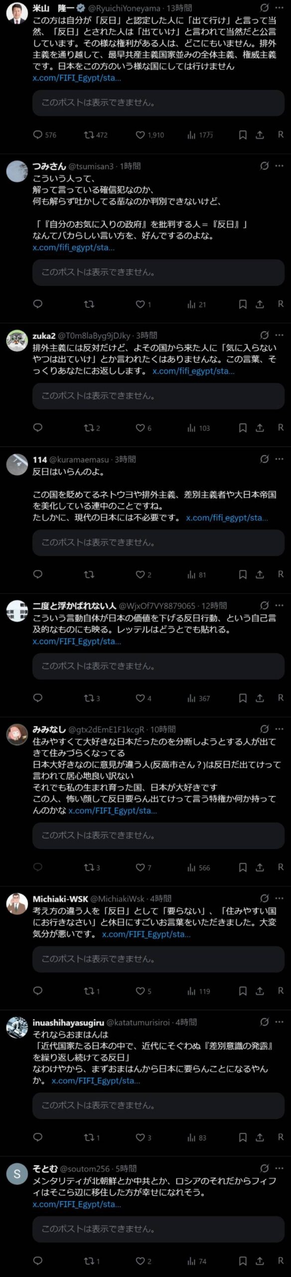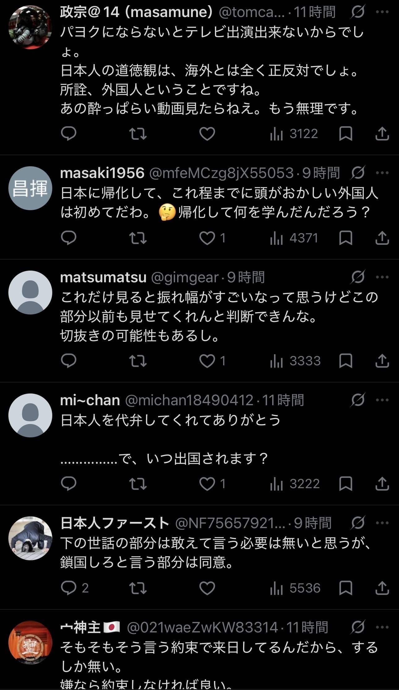 外国人だろうが日本人だろうが、反日は要らんのよ、この国に…それだけのこと。自分にとって居心地の良い住みやすい国にお行きなさい。もう10年以上も前からこんな事を発信し続けてるけど、何か間違ってるの?むしろ親切なアドバイスじゃないかな?まさかこれにまで“排外主義”なんてケチつけないよね?