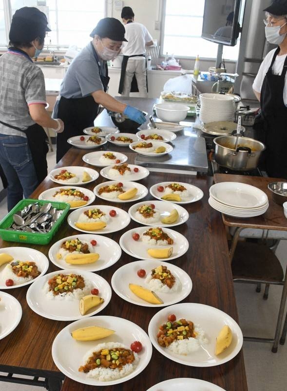 この日のメニューは夏野菜チキンカレーで、ニンジンやタマネギの他にカボチャ、ピーマン、シメジ、ナス、枝豆、トウモロコシと野菜がたっぷり入る。