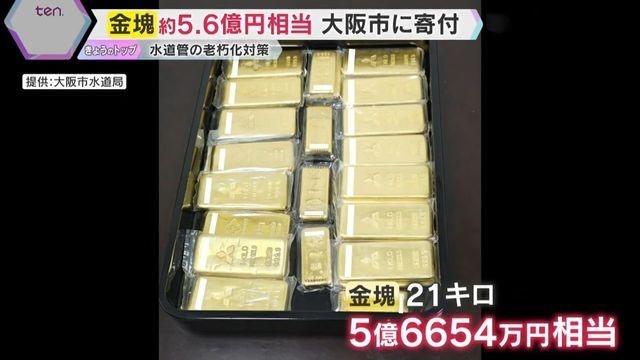 【寄付】大阪市水道局に金塊21kg・5億6654万円相当寄付される 水道管の老朽化対策などに活用へ