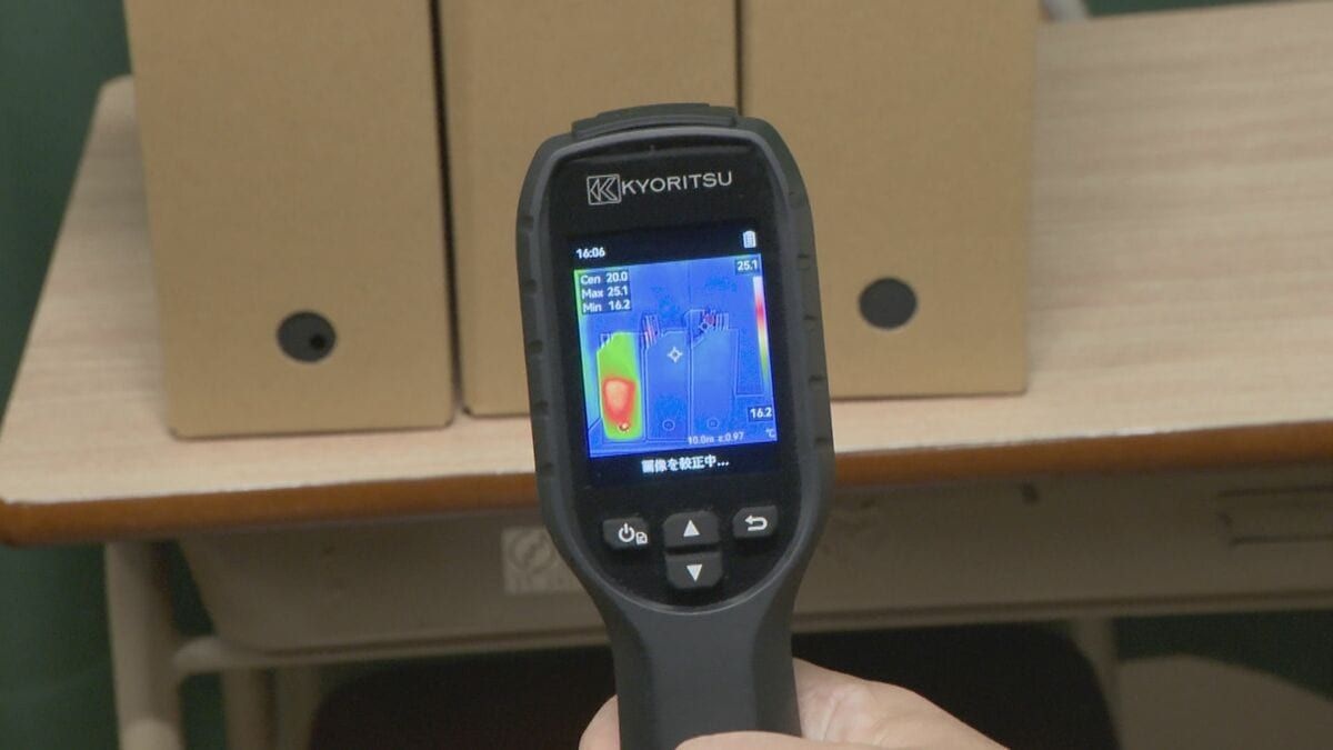「一見ただ本が並んでいるだけで違和感はありませんが、こちらのサーモグラフィカメラを当ててみると、一点が赤くなっていることが分かります」