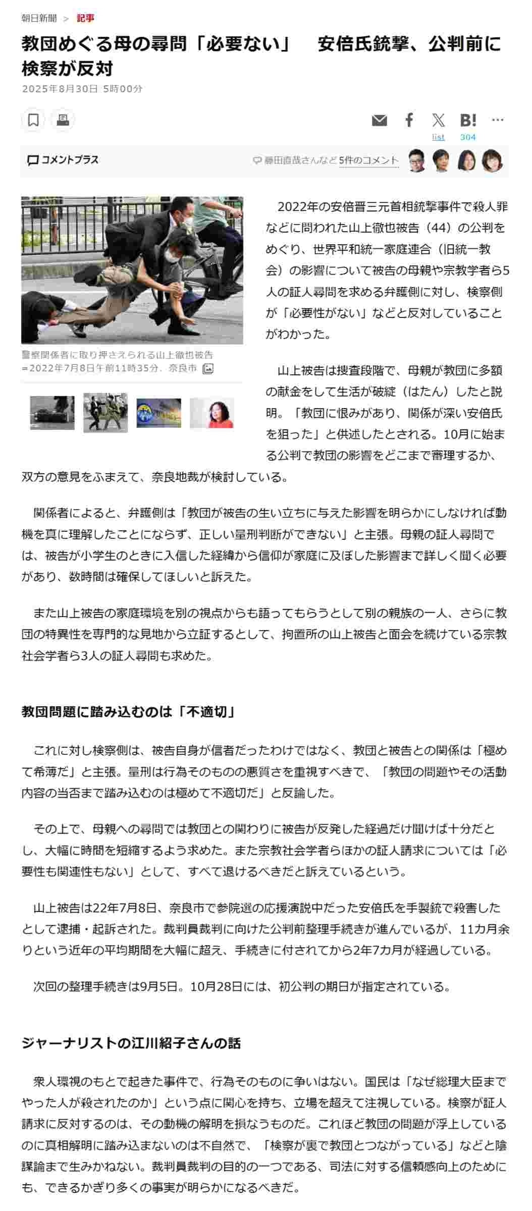 【山上】検察「安倍射殺に統一協会は関係ないだろ!山上の母親や宗教学者に証人尋問する必要なし」