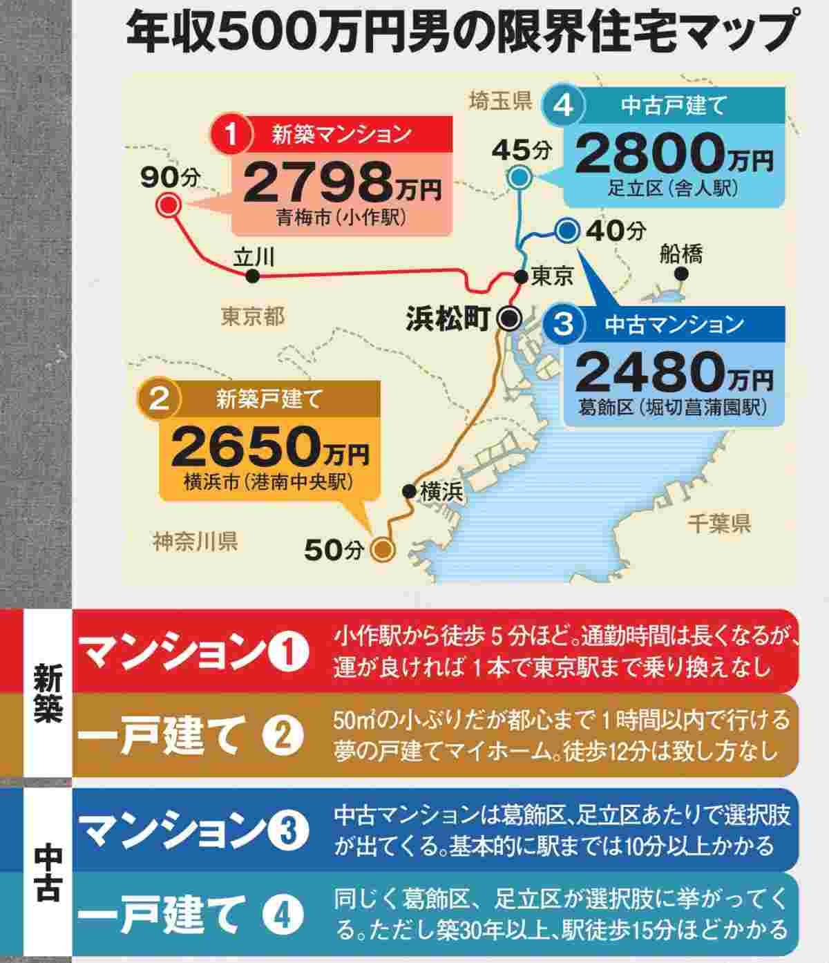 【年収500万円世帯はもはや”中流貧民”】家を買える限界のエリアを試算してみたら、侘びしい結果に…新築だと東京郊外の青梅市にあるマンション、中古物件なら、葛飾区堀切の築44年の中古マンション