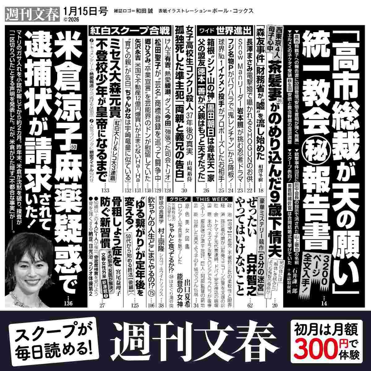 今週の『週刊文春』目次は――▼統一教会マル秘報告書を独占入手「高市早苗氏が総裁になることが天の最大の願い」