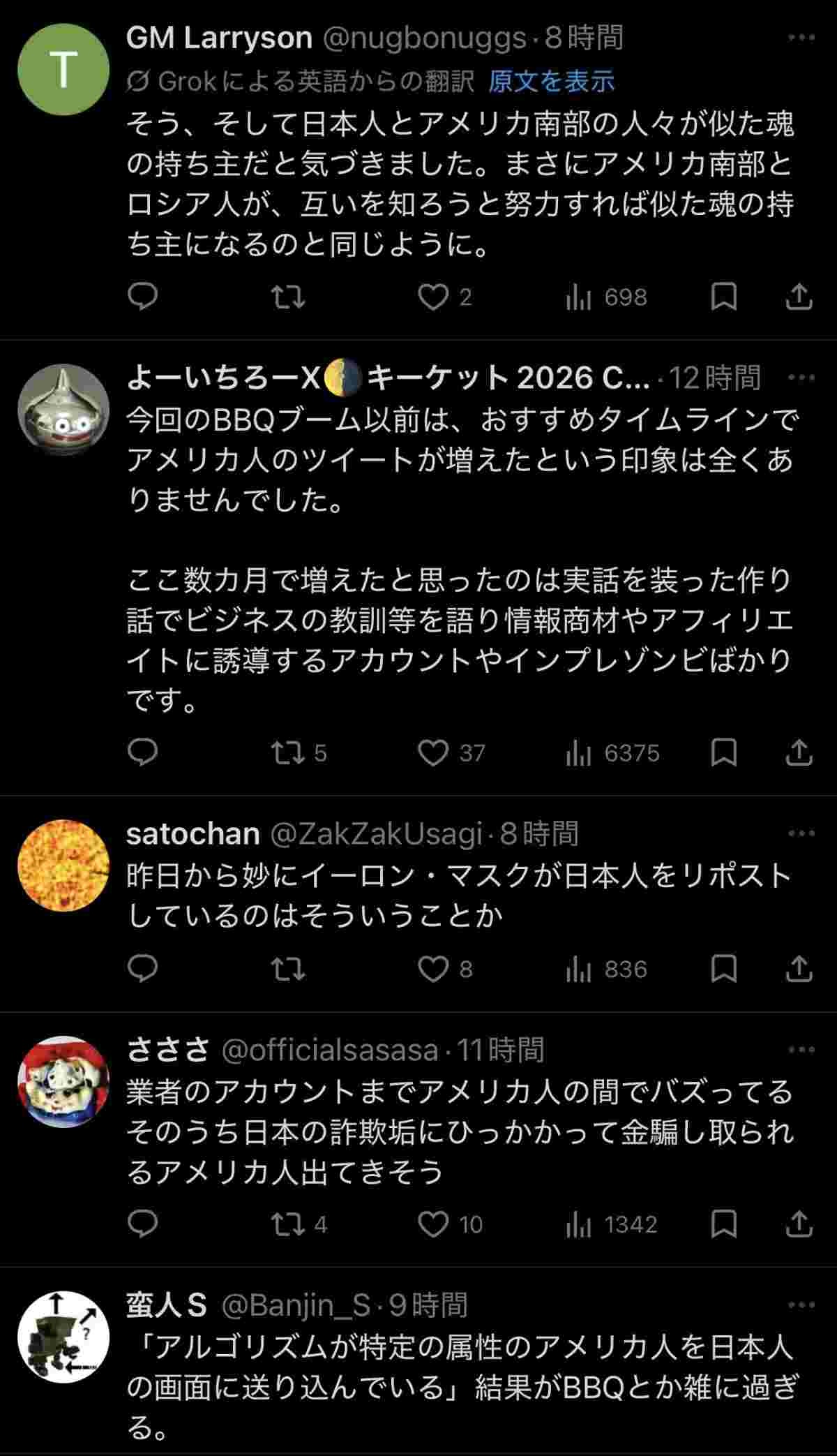 バーベキューがどうのってジャップの投稿にアメリカ人が引用付けててホルホルしてるのたくさんおすすめに流れてきて怖