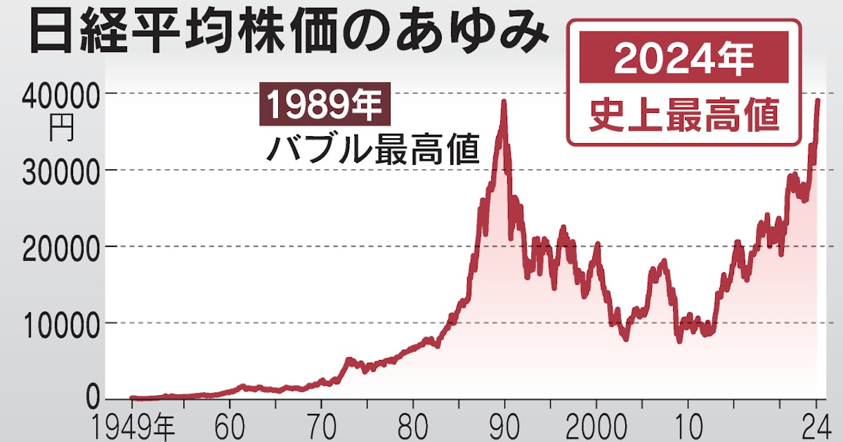 日経平均株価、終値も史上最高値 836円高の3万9098円 - 日本経済新聞