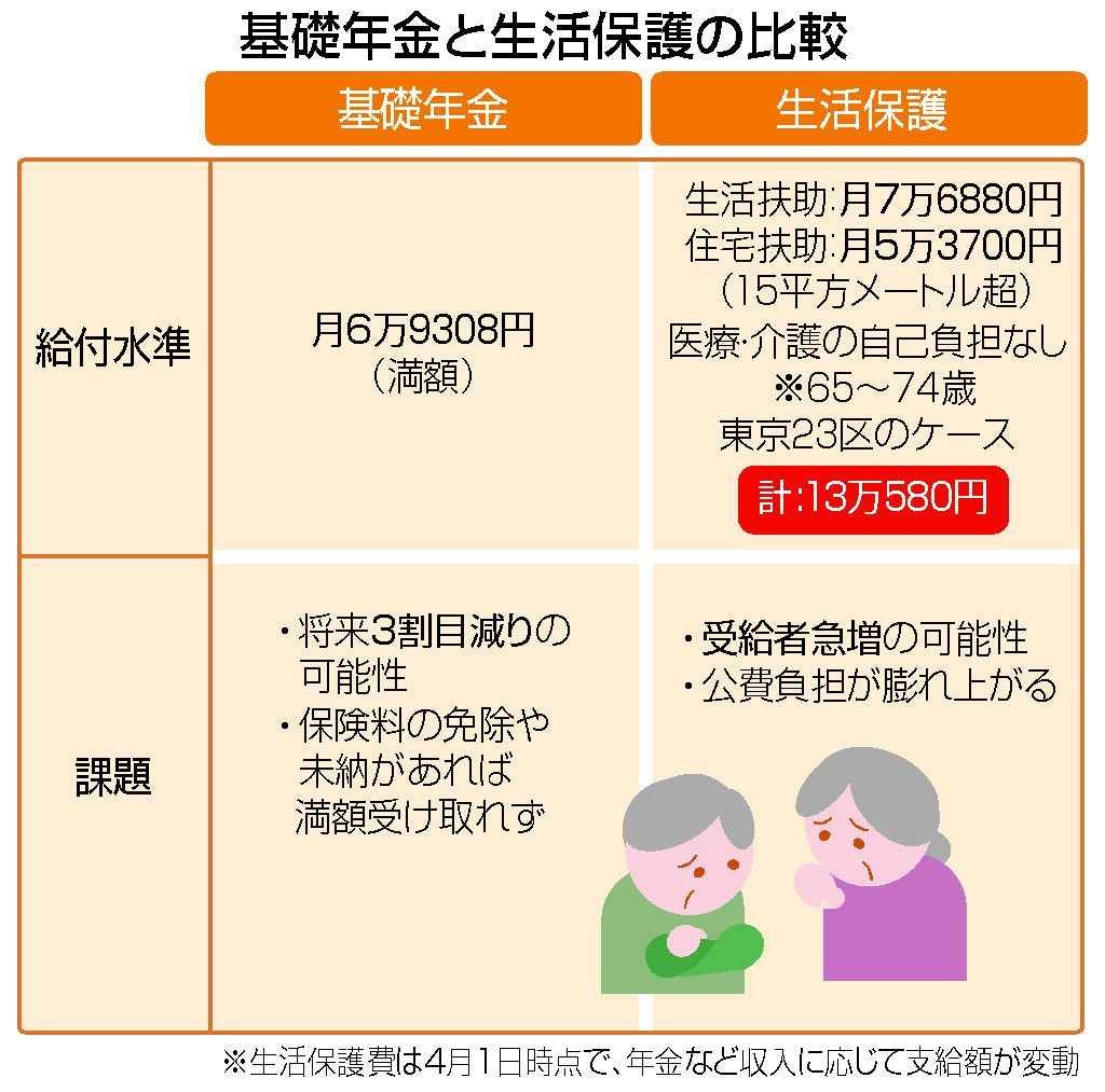 生活保護費は消費支出や物価の伸びに応じて定期的に改定される。しかし、基礎年金の給付水準は減額調整の影響で物価上昇より低く抑えられるため、生活保護との差は今後さらに広がりそうだ。