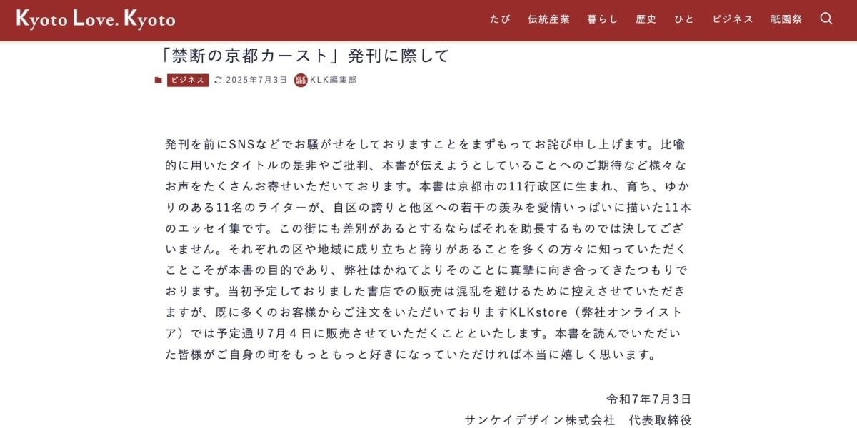 京都における「カースト」をテーマにした書籍をめぐり、出版元の「Kyoto Love. Kyoto編集部」は7月3日、公式サイトで声明を発表し、「この街にも差別があるとするならばそれを助長するものでは決してございません」と説明した。