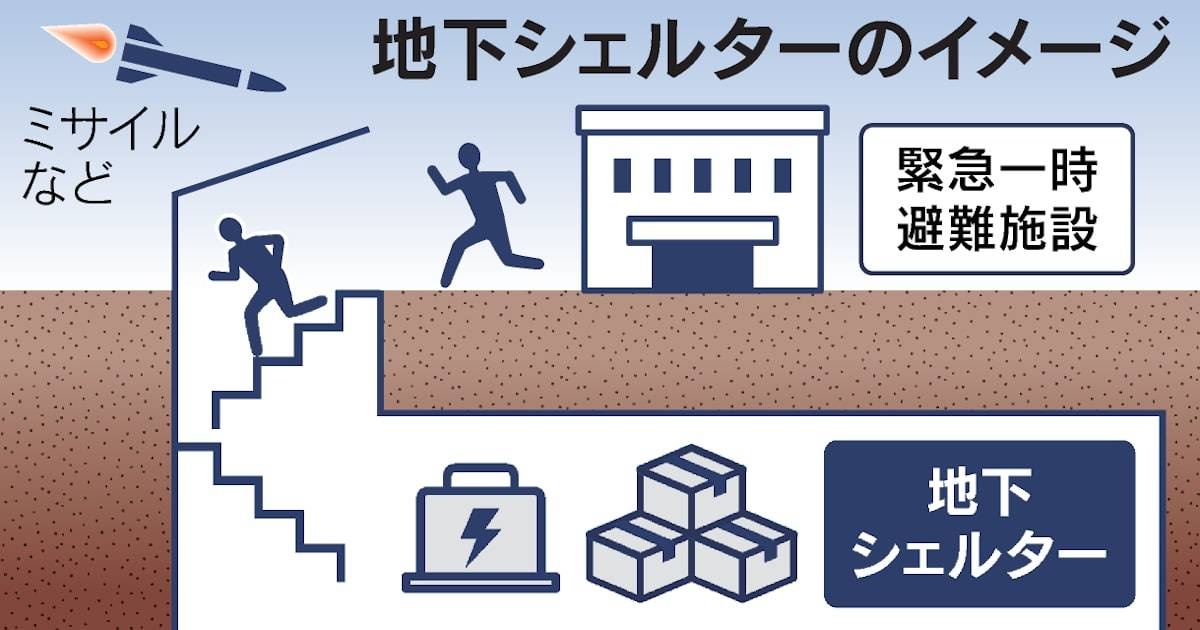 - 政府は武力攻撃から避難する国内の地下シェルターの収容人数を1000万人分に倍増させる。一時避難に活用できる商業ビルや地下駐車場といった既存施設の洗い出しを急ぐ。2025年度中に「実施方針」をまとめ、地方自治体の指定を促す。食料などの備蓄品を含むシェルターの機能など制度の設計を進める。