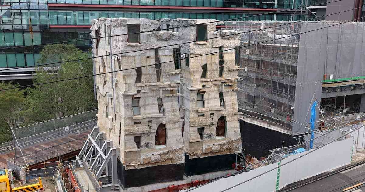 曳家工事は8月下旬から10月上旬にかけて実施され、まず東方向に約9メートル、次に南方向に約8メートル移動。岡さんらが見守る中、ビルは特別に設置されたレールに乗り、肉眼では捉えられないほどのゆっくりとしたスピードで少しずつ進んでいった。