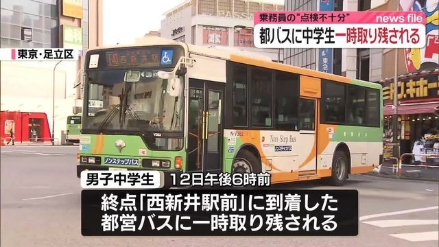 東京・足立区で、終点に到着した都営バスに男子中学生が一時、取り残されていたことがわかりました。