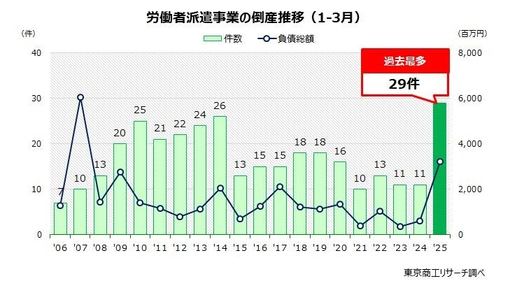 「人材派遣業」倒産、1-3月は過去最多の29件 ~ 「円高」、「トランプ関税」でさらに増加も ~ | TSRデータインサイト | 東京商工リサーチ人手不足で人材の獲得競争が厳しさを増すなか、人材派遣会社(労働者派遣業)の倒産が急増している。www.tsr-net.co.jp - 2 : 2025/05/03 08:12:54 yd5LO