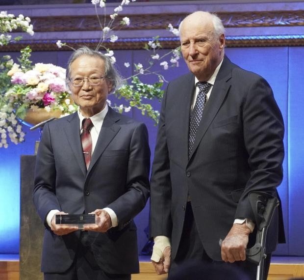 ノルウェー国王から直接盾を受け取った柏原さん。授賞式でのスピーチでは「数学において新しいものを創造することが大切だと(恩師の)佐藤幹夫氏から学び、研究人生での重要な指針となった」と話し、妻への感謝も述べた。満員の会場からは長い拍手が続いた。