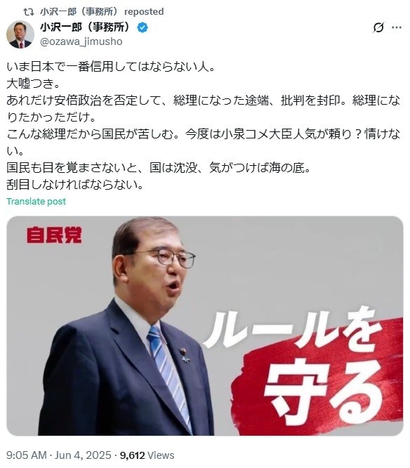 小沢一郎氏「日本で一番信用してはならない人」をズバリ痛烈指摘「大嘘つき」(日刊スポーツ) - Yahoo!ニュース立憲民主党の小沢一郎衆院議員が4日、自身のX(旧ツイッター)を更新。「一番信用してはならない人」についてズバリ指摘した。 小沢氏は、「ルールを守る 自民党」と書かれ、石破茂首相が写った画像を添news.yahoo.co.jp - 2 : 2025/06/04 15:07:13 Rrggx