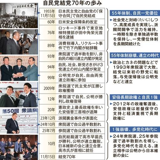 自民党は15日、1955年の結党から70年を迎えた。節目の今年は衆院に続き参院でも少数与党に転落し、公明党との四半世紀に及ぶ連立も解消。戦後ほぼ一貫して与党だった自民が政権を失いかねない危機だ。高市早苗首相は、長期政権を築いた安倍晋三政権にならい、保守路線への回帰で党勢回復を目指すが、「政治とカネ」で失墜した信頼の回復は容易でなく、結党以来掲げる「国民政党」に立ち返る道筋は描けていない