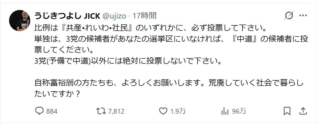 その上で「じゃあどこに投票するのか? (続く)」として、次の投稿で「比例は『共産・れいわ・社民』のいずれかに、必ず投票して下さい。単独は、3党の候補者があなたの選挙区にいなければ、『中道』の候補者に投票してください。3党(予備で中道)以外には絶対に投票しないで下さい」と“対案”もポスト。「自称富裕層の方たちも、よろしくお願いします。荒廃していく社会で暮らしたいですか?」と締めくくった。