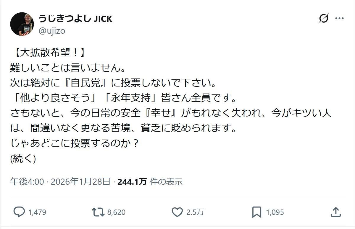うじきは「【大拡散希望!】難しいことは言いません。次は絶対に『自民党』に投票しないで下さい。『他より良さそう』『永年支持』皆さん全員です」と呼びかけた。その理由として「さもないと、今の日常の安全『幸せ』がもれなく失われ、今がキツい人は、間違いなく更なる苦境、貧乏に貶められます」とつづっている。
