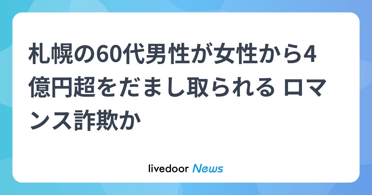 札幌の男性が4億円超のロマンス詐欺被害 - ライブドアニュース北海道警は29日、札幌市東区の60代男性がSNSで知り合った女性から暗号資産投資を勧められ、計4億600万円をだまし取られたと発表した。ロマンス詐欺事件とみて捜査する。news.livedoor.com - 2 : 2025/05/29 19:48:59 m26Vr