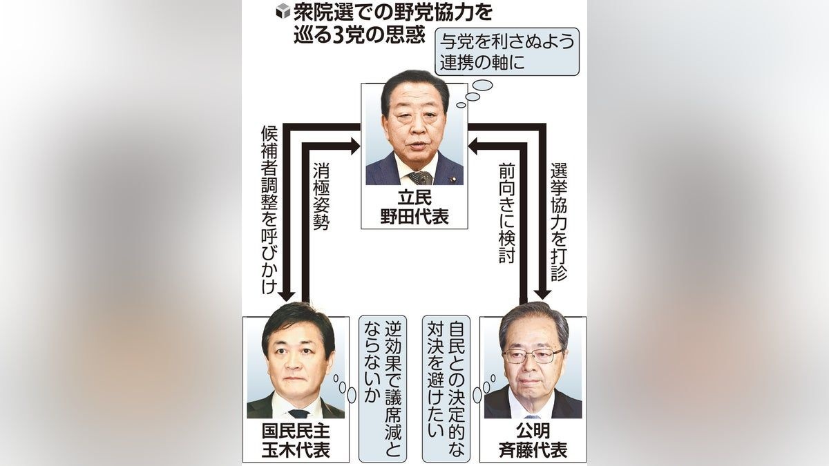 立憲民主党の野田代表が、衆院解散・総選挙に向けて公明、国民民主両党との選挙協力に意欲を示している。野党がそれぞれ候補者を擁立すれば、政権批判票が割れ、与党に有利に働く可能性があるためだ。