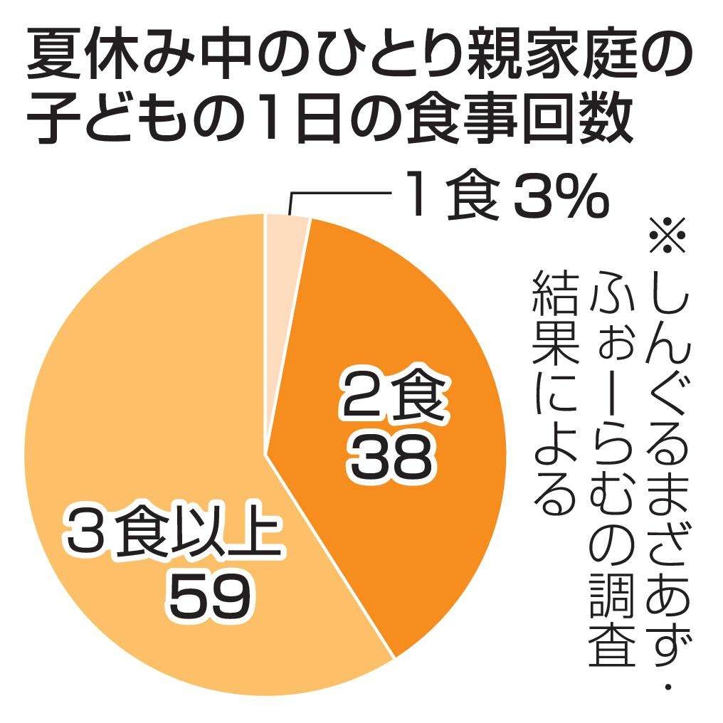 NPO法人「しんぐるまざあず・ふぉーらむ」が7月下旬、ひとり親家庭を対象に調査。全国の約3900人が回答し、7割が小中学生のいる家庭だった。全体のうち38%が「1日2食」、3%が「1日1食」で夏休みを過ごしていると答えた。