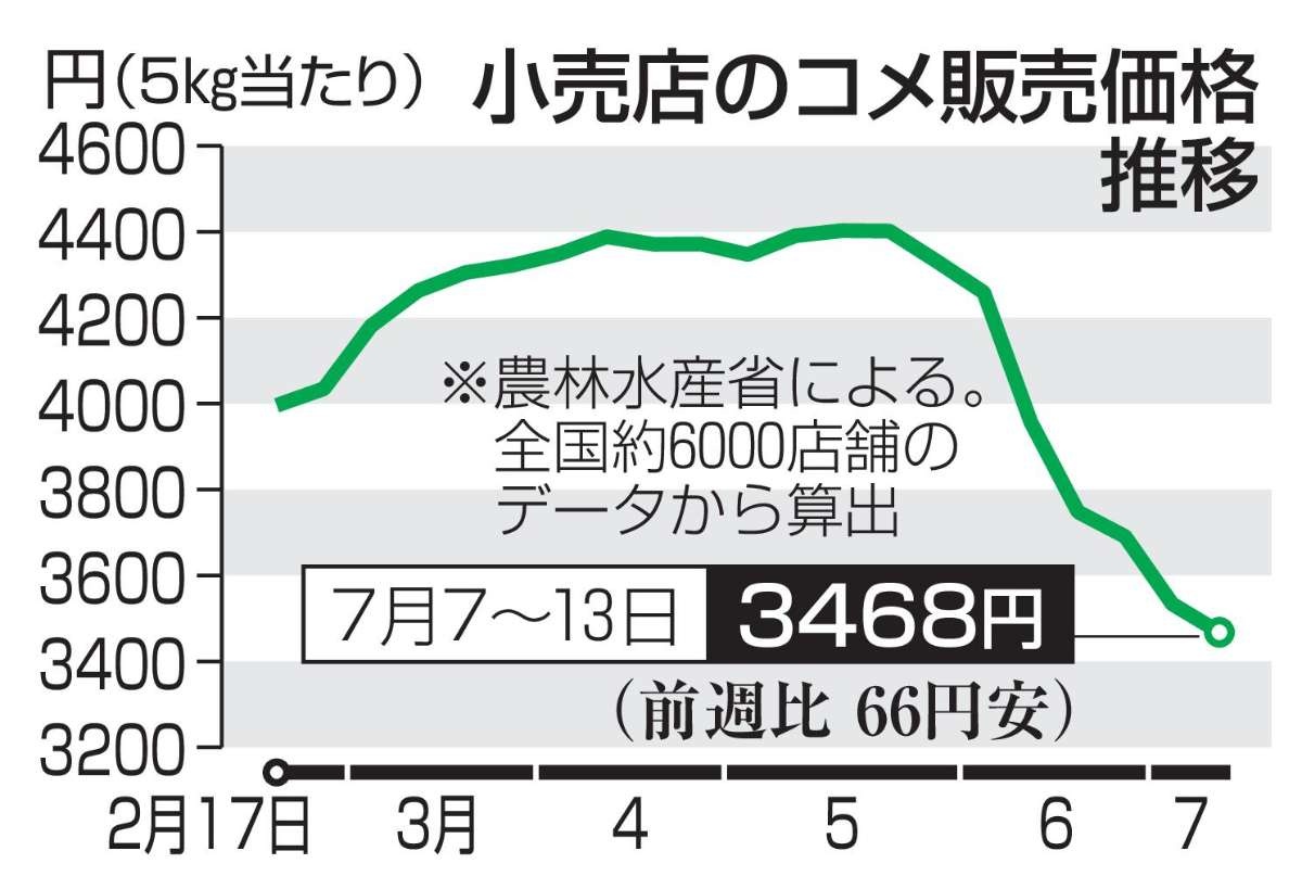 農林水産省は18日、7~13日に全国の小売店で販売されたコメ5キロの平均価格が前週よりも66円安い3468円だったと発表した。