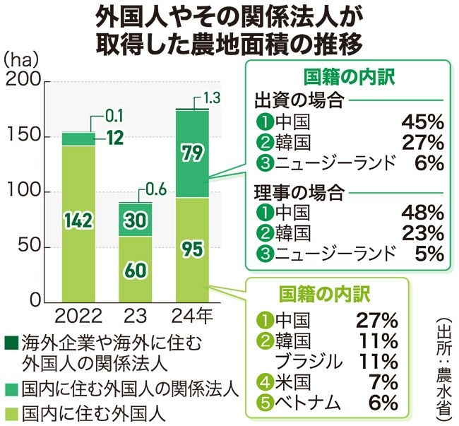 農水省は、外国人やその関係法人が2024年に取得した日本国内の農地面積が175・3ヘクタールに上り、比較可能な22年以降で過去最多だったと発表した。日本に住む外国人が営農目的で取得するケースが多かった。今回、個人や法人など取得者の形態ごとに国籍の内訳を初めて公表したが、いずれも中国が最多だった。