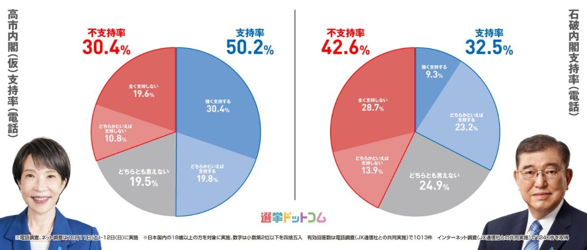 「選挙ドットコム」の「支持政党別 自公連立離脱をどう思うか?」という全国調査の結果によると、自民党の支持層の約5割、公明党の支持層の約8割が「評価する」と答えたことがわかった。また「高市氏が総理大臣に指名された場合支持するか?」という調査には、約50%強が支持すると回答している。