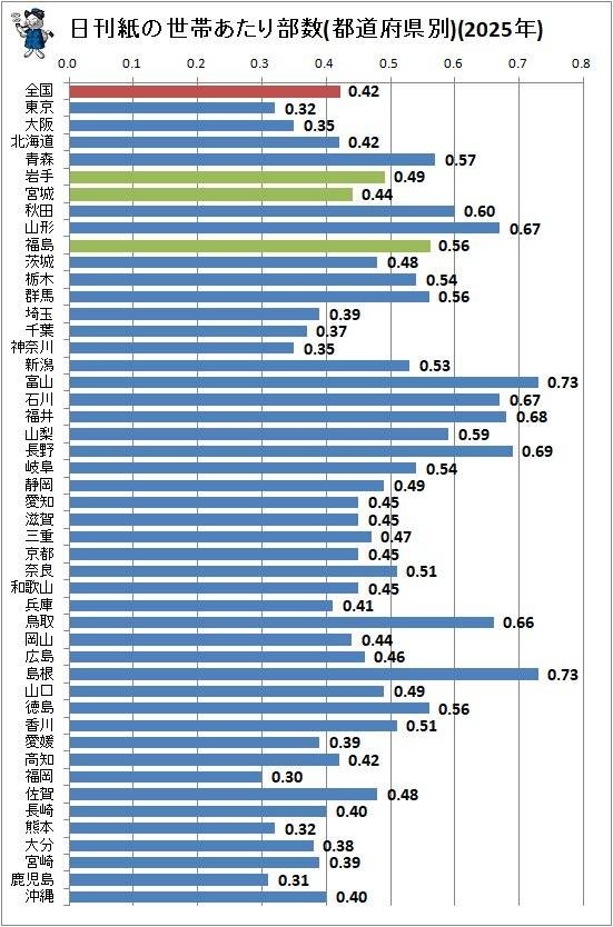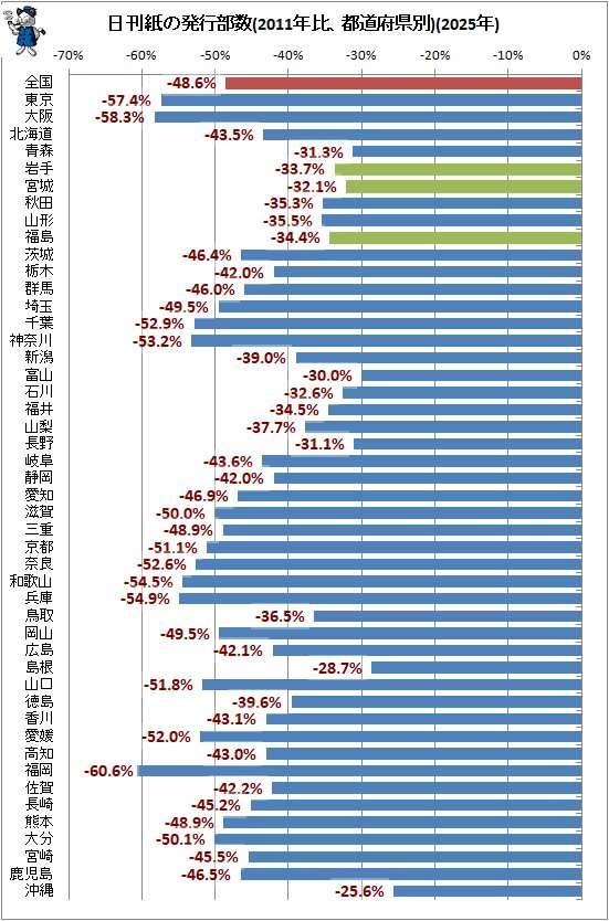 【都市居住者の新聞離れが大きい】都道府県別の新聞発行部数、全地域で前年比減少