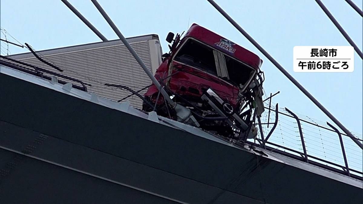 13日未明、長崎県の海にかかる橋の上で事故があり、大型トレーラーが欄干に突っ込みました。
