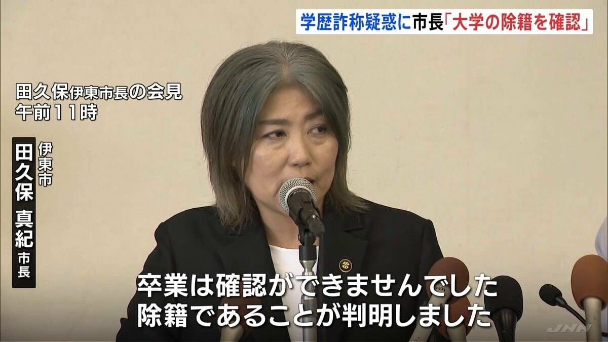 今年5月に初当選し、学歴詐称疑惑が浮上していた静岡県伊東市の田久保真紀市長が先ほどから会見を開き自ら大学を除籍になっていたと明らかにしました。