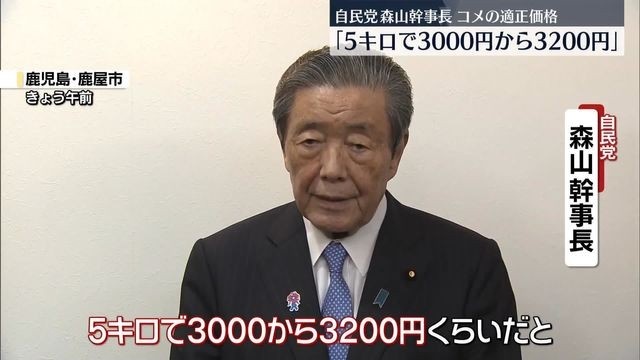 自民党の森山幹事長は、鹿児島県鹿屋市で記者団に対し、コメの適正な価格について、「5キロで3000円から3200円」との認識を示しました。