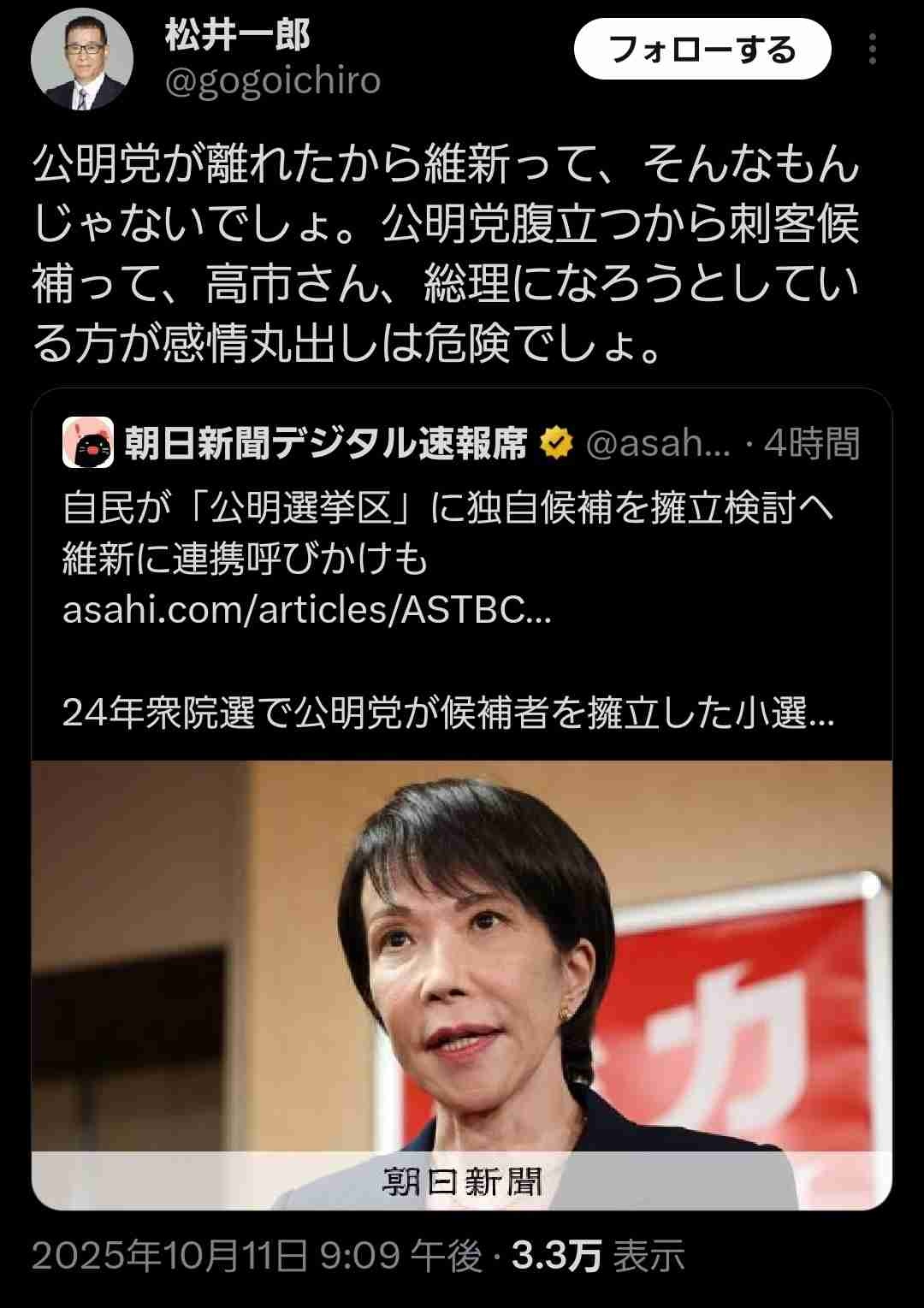 公明党が離れたから維新って、そんなもんじゃないでしょ。公明党腹立つから刺客候補って、高市さん、総理になろうとしている方が感情丸出しは危険でしょ。