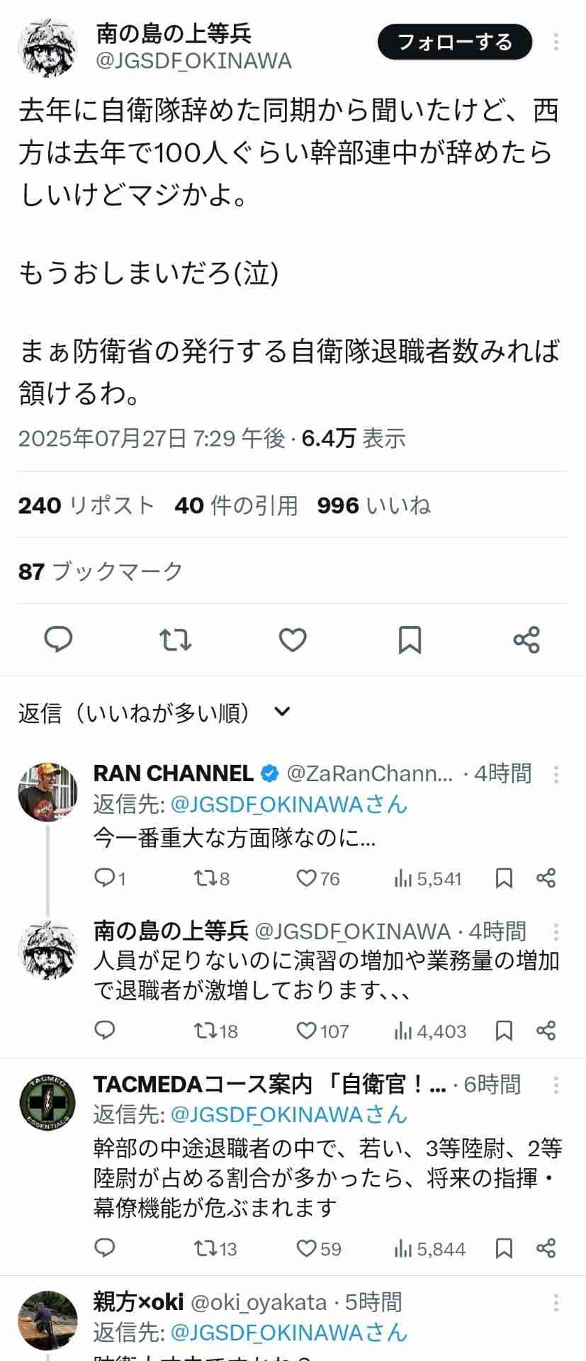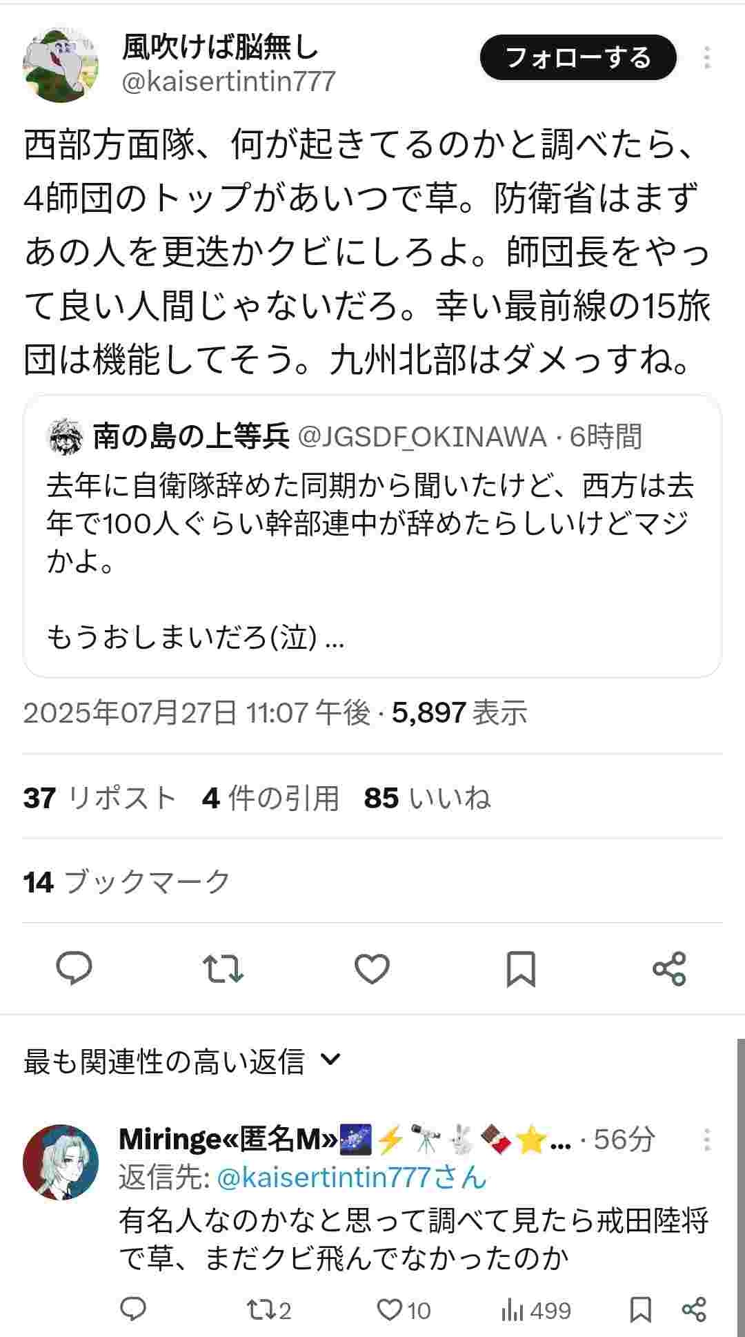 【🦎戦わなければ亡びるわよ悲報】陸自西部方面隊(九州・沖縄)、幹部が辞めまくって崩壊状態になってる模様www😭いったい何が起きてるんです?🤔