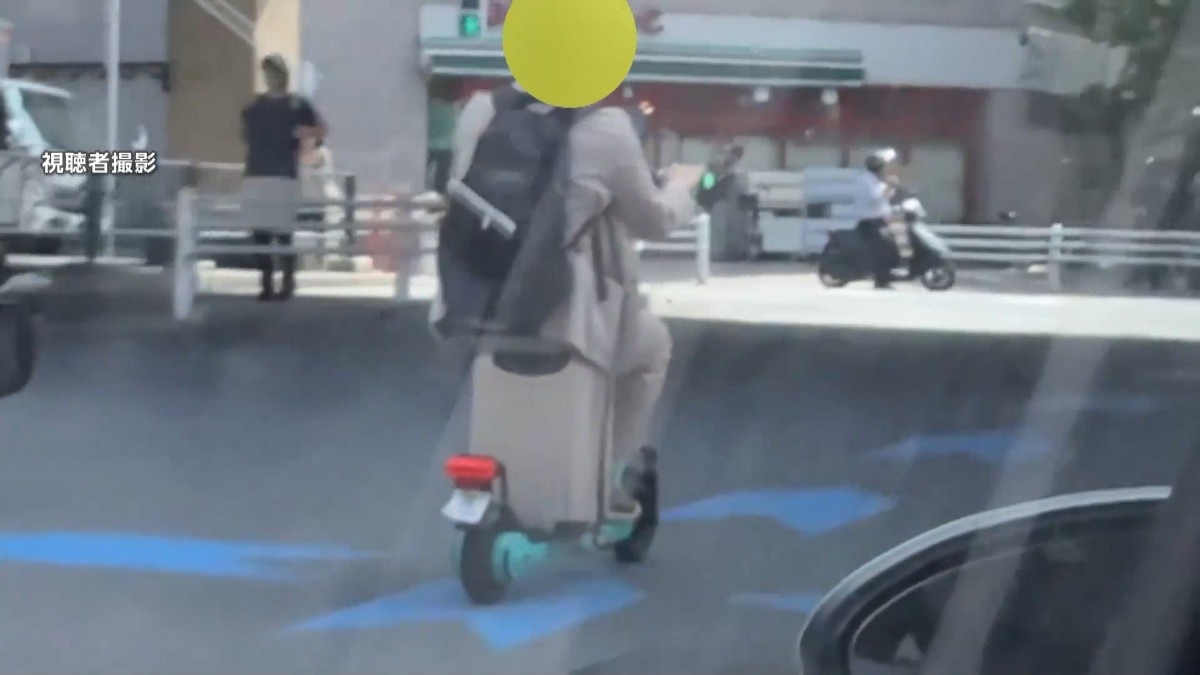 【LUUP】スーツケースに腰掛けて電動キックボードを運転…東京・中野区の車通りの多い道路で「道交法違反なので絶対やめて」